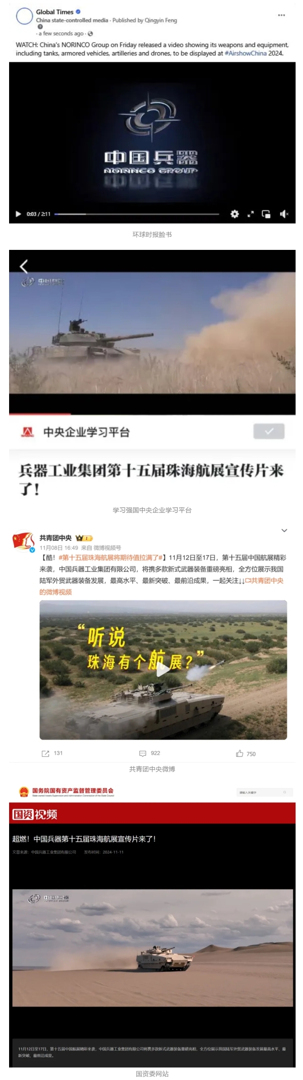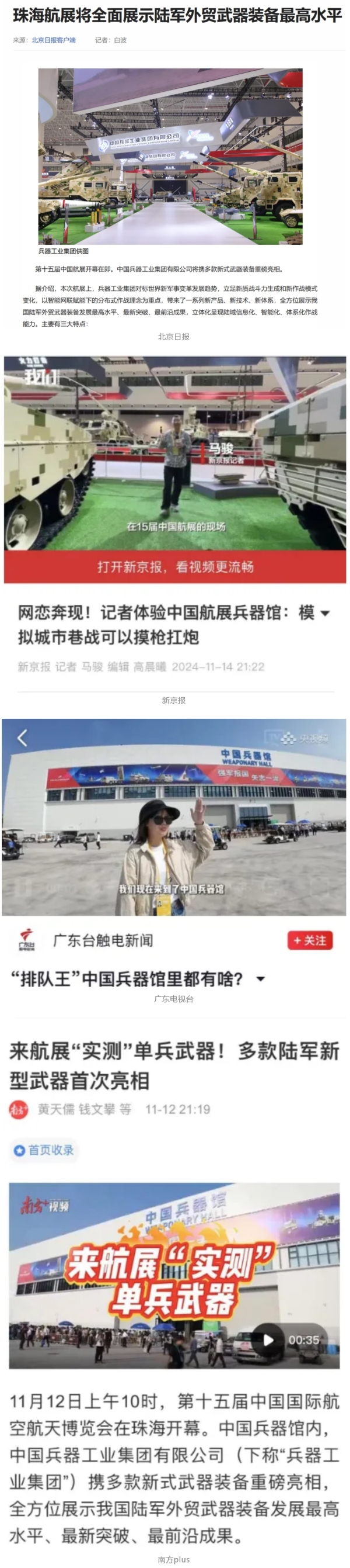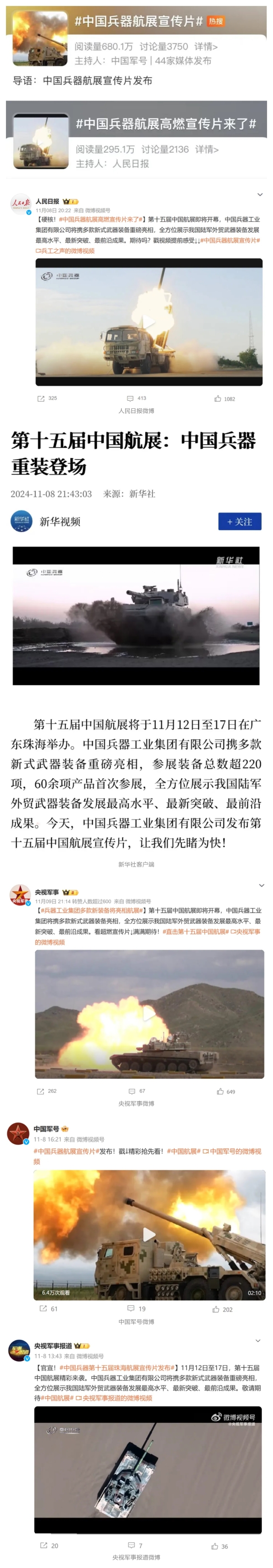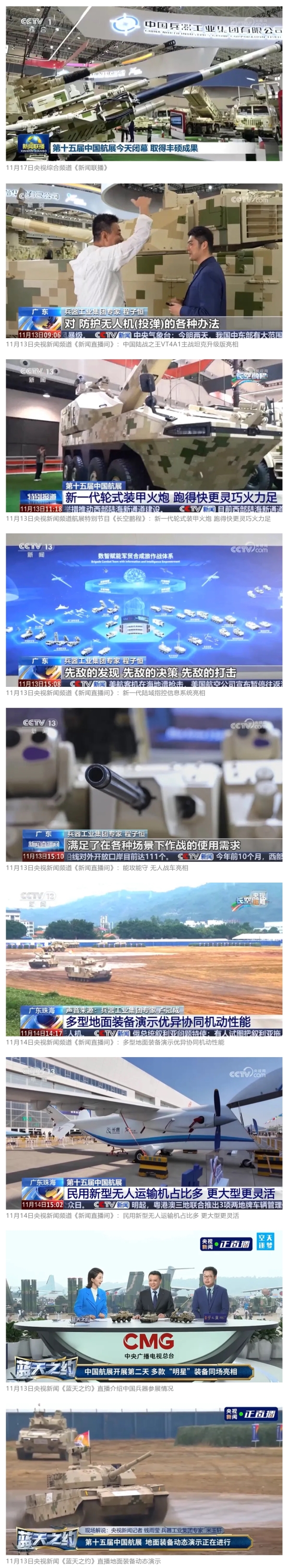 11月13日央视新闻《蓝天之约》直播地面装备动态演示此次航展,央视综合频道《新闻联播》《晚间新闻》、新闻频道《新闻直播间》《新闻30分》《朝闻天下》《共同关注》《东方时空》《午夜新闻》、财经频道《天下财经》《经济信息联播》《正点财经》《第一时间》、中文国际频道《今日环球》《中国新闻》、国防军事频道《军事报道》《正午国防军事》《国防军事早报》《军迷行天下》等栏目共播出兵器工业集团参展相关新闻报道40余条。11月10日央视新闻频道《新闻30分》11月10日央视中文国际频道《中国新闻》11月10日央视国防军事频道《军事报道》11月11日央视国防军事频道《正午国防军事》